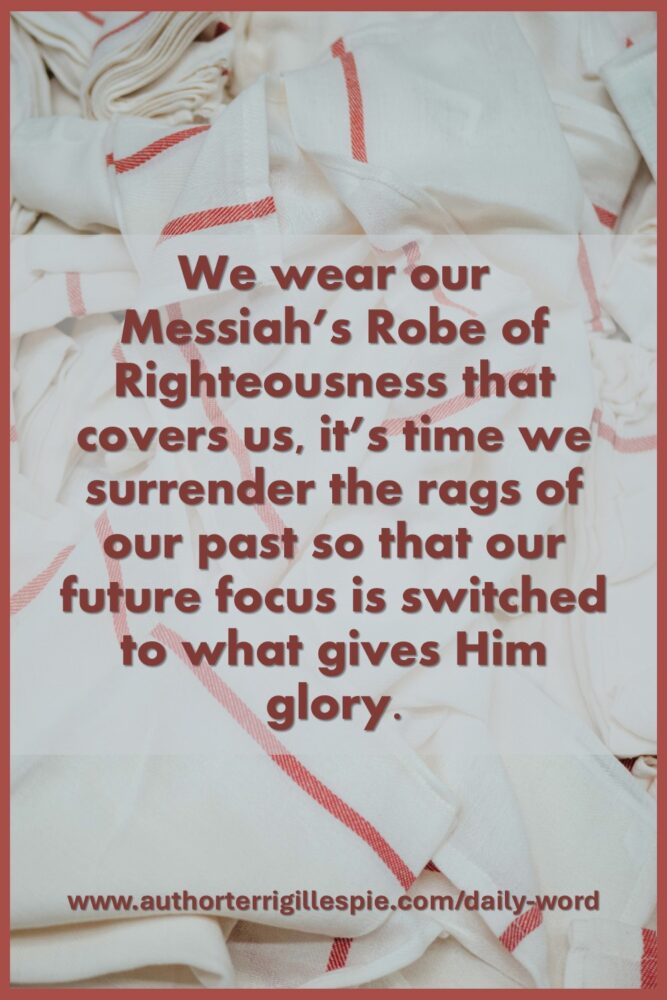Let’s remove the vestiges of our past — little by little — so that we can clothe ourselves in that tender compassion. We wear our Messiah’s Robe of Righteousness that covers us, it’s time we surrender the rags of our past so that our future focus is switched to what gives Him glory.