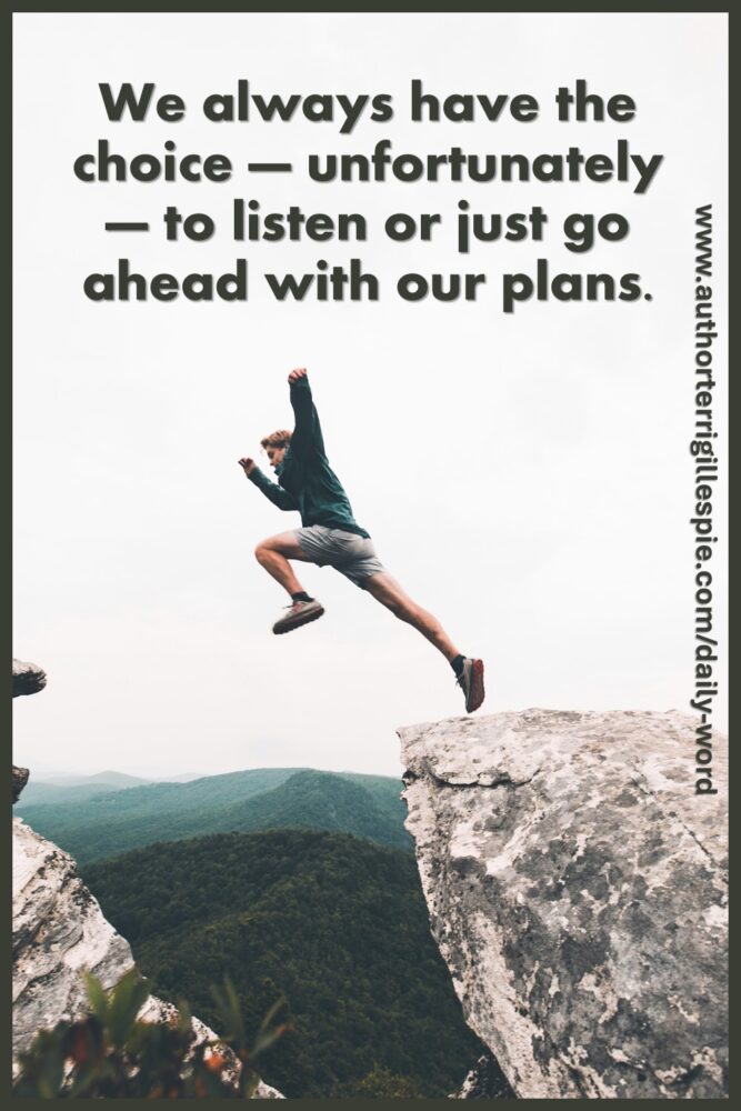 listen or just go ahead with our plans. Generally, I need reminding each morning that I want my Father’s will to be done, not just what I want. I may think I know His plans, but …