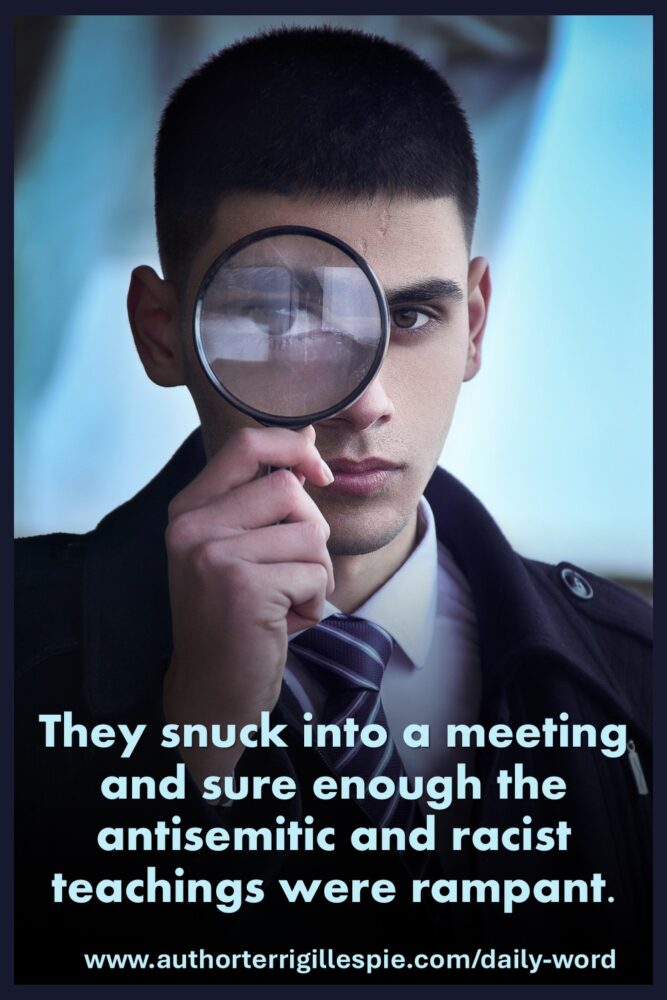 Back in the late 1970s, my 4’11” mother and her cousin had heard that a local “evangelical” organization that was a branch of a reputable international organization, was a front for a white supremacy group. They snuck into a meeting and sure enough the antisemitic and racist teachings were rampant. My mother reported them to the Anti-Defamation League (ADL), who reported them to higher government authorities who then disbanded the group.